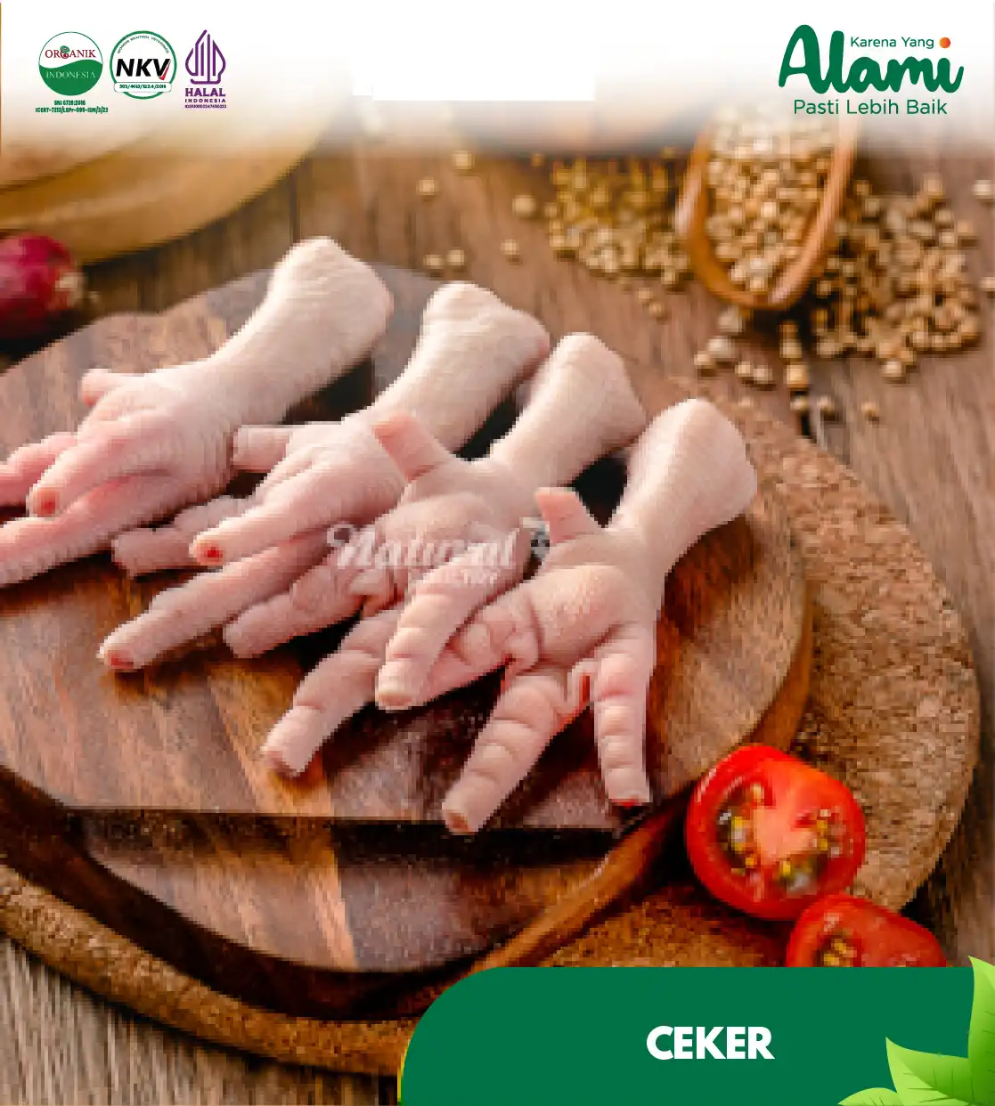 Ceker Ayam Negeri Ras Broiler. Ayam dipelihara secara Organik, diberi asupan probiotik + 11 herbal, dan dipelihara tanpa menggunakan atau terpapar bahan kimia apapun. Memiliki daging yang rendah lemak, tinggi protein, cepat empuk, bebas amis, dan memiliki rasa gurih alami.